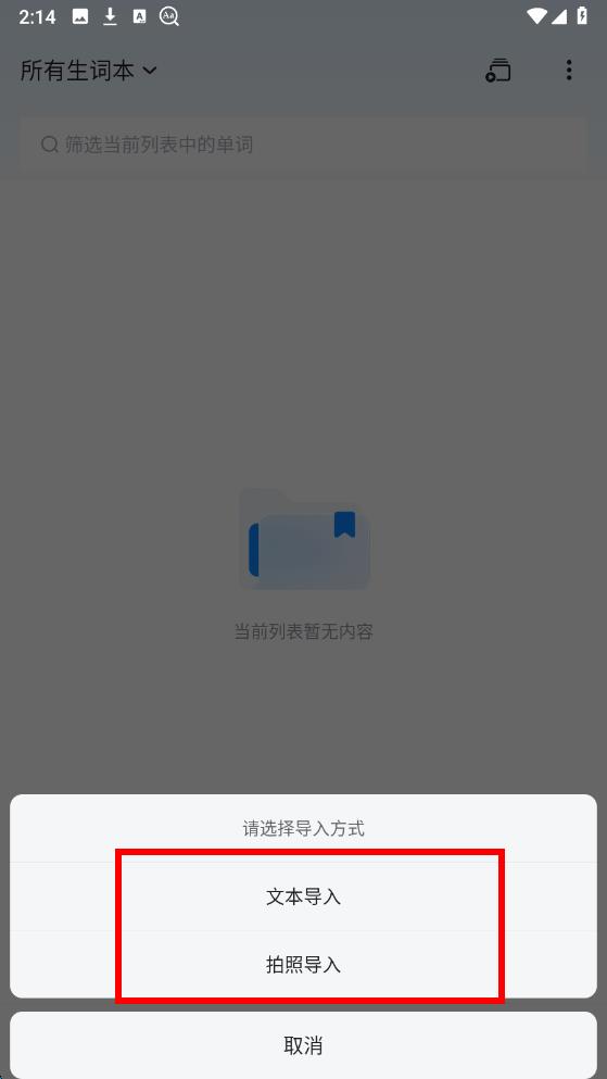 3、可以選擇文本導入,將存儲生詞的文本內容導入,也可以選擇拍照導入,拍攝包含生詞的紙張內容來導入生詞,按提示完成操作即可。