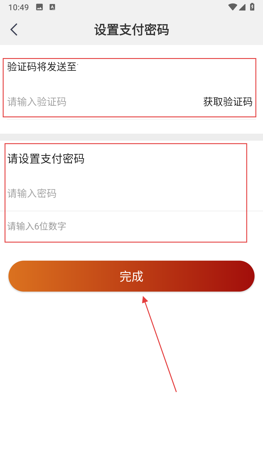 4、在設(shè)置支付密碼的驗證界面,將獲取到的驗證碼輸入到對應(yīng)框中,輸入要設(shè)置的6位數(shù)字支付密碼,點(diǎn)擊完成即可。