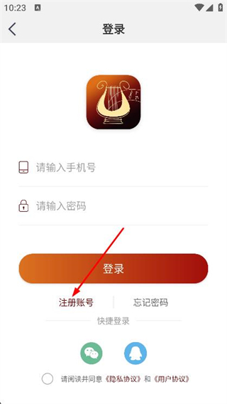 1、打開音樂殿堂app,在登錄頁面點(diǎn)擊注冊賬號選項。