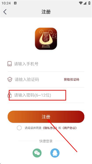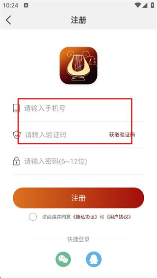 2、進(jìn)入注冊頁面后,在輸入框中填寫手機(jī)號和驗證碼。