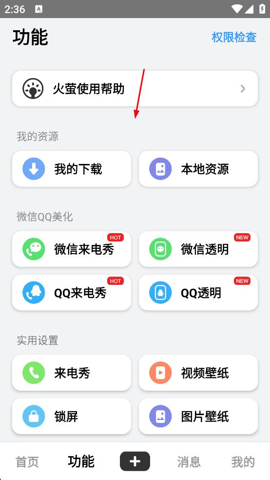 3、在功能頁面,可看到火螢使用幫助、我的資源、微信QQ美化等板塊,按需點擊對應功能入口,開展操作 。