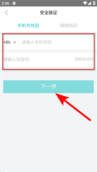 2、選擇找回方式,若選手機號找回,輸入手機號碼和驗證碼,點擊下一步。