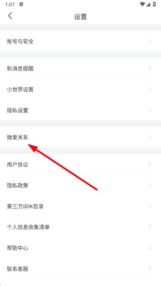 3、在設(shè)置界面里,找到并點(diǎn)擊微愛關(guān)系選項(xiàng),進(jìn)入微愛關(guān)系管理頁面。