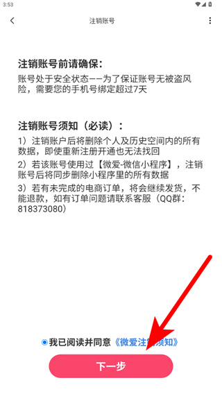 3、在注銷賬號頁面,仔細(xì)閱讀注銷須知后,點(diǎn)擊下一步按鈕,按照提示完成賬號注銷操作。