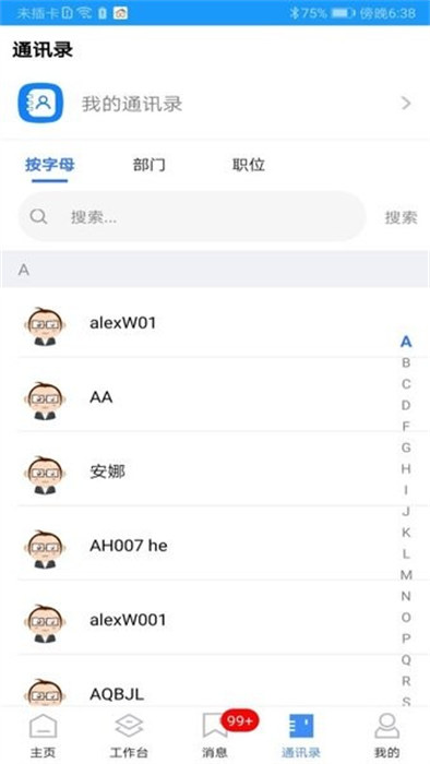 3、通訊錄:您可能忘了同事的電話或其它聯(lián)系方式,但只要登陸平臺(tái)即可查找他(她)的聯(lián)系方式,并且可以點(diǎn)擊通訊錄電話或郵件即可對(duì)同事進(jìn)行電話聯(lián)系(需要獲取手機(jī)聯(lián)系人數(shù)據(jù)權(quán)限和打電話權(quán)限)
