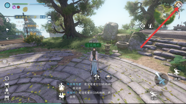 以手機(jī)舉例,左側(cè)為搖桿區(qū),負(fù)責(zé)控制玩家的上下左右移動。右側(cè)為技能區(qū),玩家可以攜帶5個職業(yè)技能,右上方為輕功按鈕,右下方為燕回風(fēng)。最右側(cè)為望氣技能。正中間顯示玩家的血條和怒氣條(藍(lán)條)。