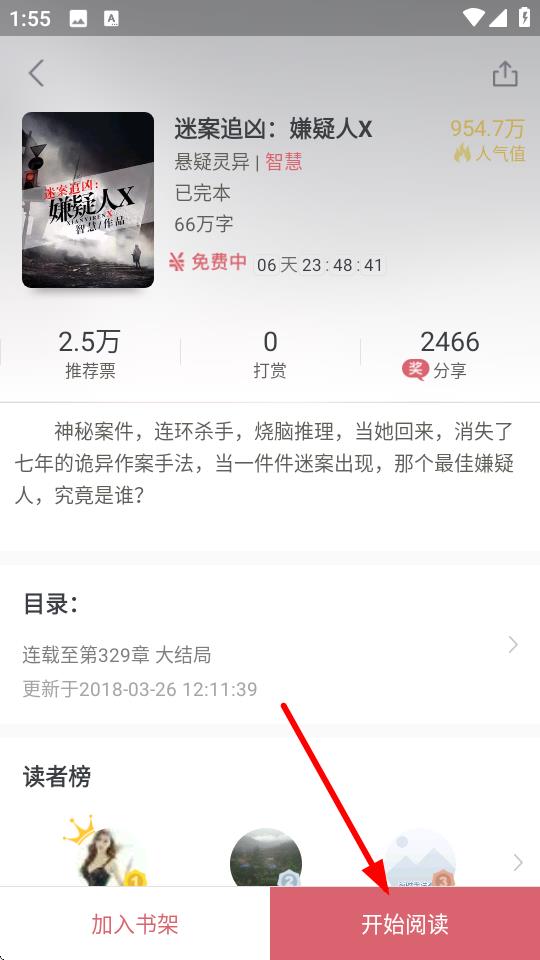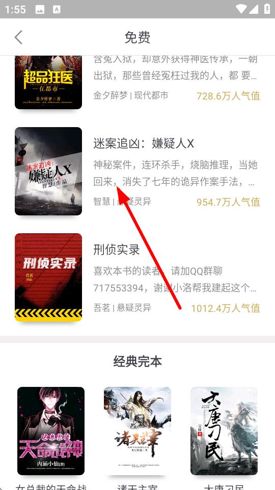 1、打開火星小說app,在免費(fèi)頁面選擇一本小說,比如點擊迷案追兇:嫌疑人X。