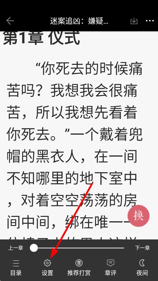 3、在小說閱讀界面中,點擊屏幕中間位置,喚出底部菜單。點擊底部菜單中的設(shè)置選項。