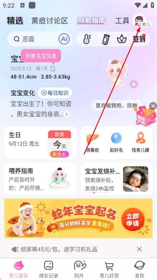 1、打開媽媽網孕育應用,點擊頁面右上角的育兒圖標。