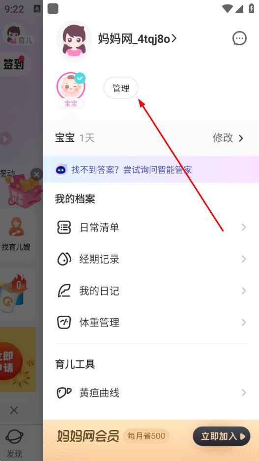 2、在彈出的側邊欄中,點擊寶寶頭像旁的管理選項。