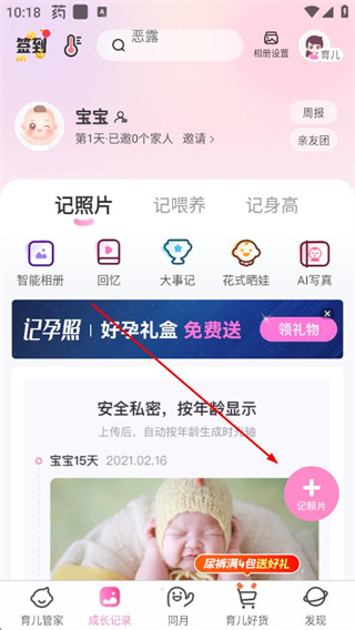 2、在成長記錄頁面選擇記照片標簽,點擊記照,可上傳寶寶照片記錄成長瞬間。