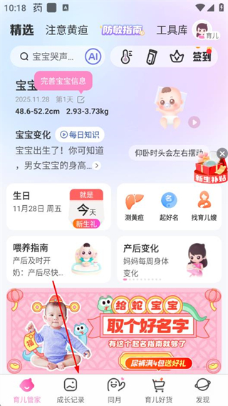 1、在媽媽網孕育App首頁點擊底部的成長記錄選項,進入成長記錄頁面。