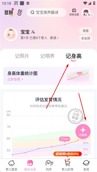 4、切換成記身高標簽,點擊記身高,可錄入寶寶的身高、體重數據,跟蹤發(fā)育情況。