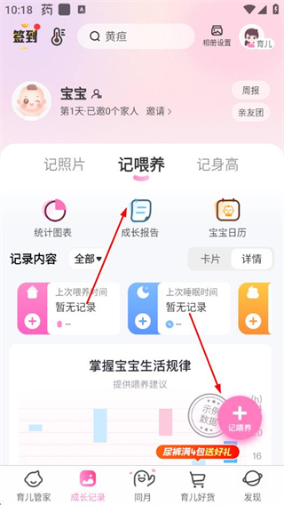 3、切換到記喂養(yǎng)標簽,點擊記喂養(yǎng),可記錄寶寶的喂養(yǎng)時間、方式等信息。