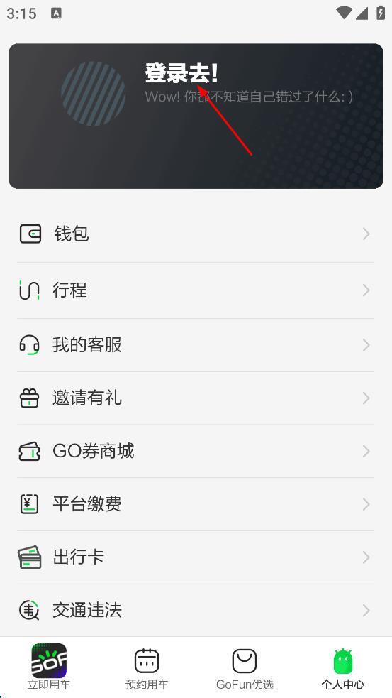 1、打開某出行軟件,在軟件界面找到“個(gè)人中心”選項(xiàng),點(diǎn)擊該選項(xiàng)進(jìn)入個(gè)人中心頁面。