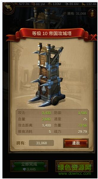 攻城器械攻擊距離最遠(yuǎn),負(fù)重高,適合遠(yuǎn)程打擊一切部隊(duì),在攻擊對(duì)方城池、掠奪對(duì)方資源時(shí)可以發(fā)揮出極大的優(yōu)勢!