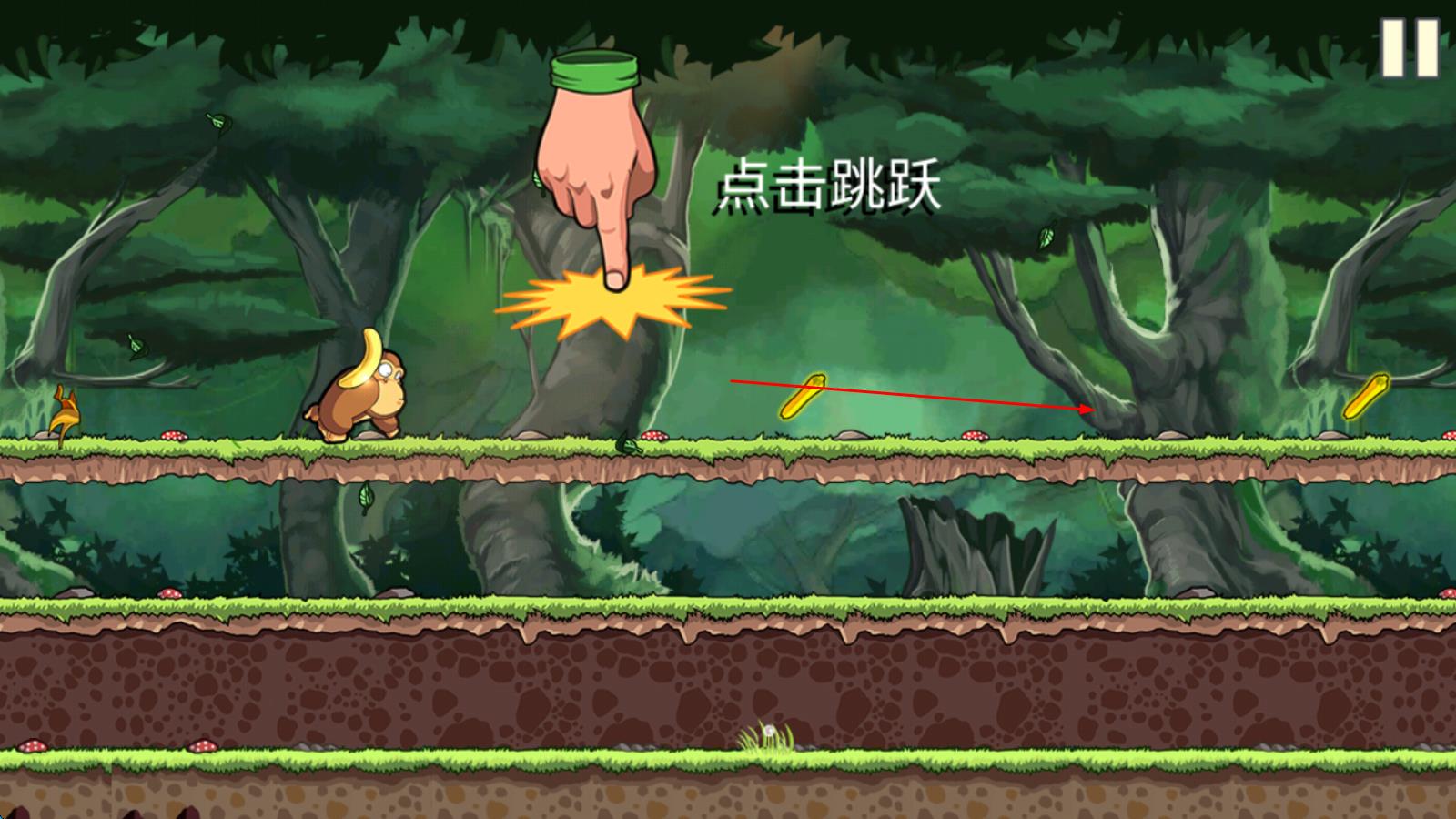 游戲的主角是一只呆頭呆腦的肥猩猩,看見香蕉就毫無節(jié)制的狂吃,直到那堆積如山的香蕉皮鋪天開地如排山倒海般洶涌而至,貪嘴的肥猩猩頓時傻了眼。怎么辦?跑??!在游戲中,肥猩猩不但要避免被身后的香蕉皮大軍淹沒,還要躲避逃亡道路上的種種障礙,木球、石柱、水潭等等,一不小心跌入這些陷阱可就Game Over了。要想順利的躲避這一切,將這場逃亡之路行的更長更遠就要看玩家的反應與操控了。游戲共有4種單指操作,分別是點擊跳躍,下劃下滾,長按滑翔以及右劃加速,玩家控制我們的主角肥猩猩上躥下跳滑行打滾,在不同的動作間切換時非常流暢毫無卡頓,手感非常好。