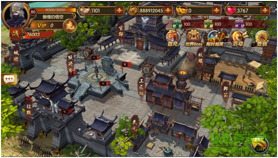 屏幕右上方開始第一排從左到右依次石材、銀兩、元寶、體力的圖標和數(shù)量,第二排從左到右繁榮度、發(fā)展度、聲望度的圖標數(shù)量。第三排為各類活動模塊的鏈接入口,點擊分別進入首充界面、群英會界面、限時商店、活動界面、簽到界面。