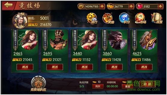 從主界面的菜單欄點擊競技場進入此模塊,界面左上角箭頭為返回主界面按鈕、右上角第一行從左至右分別為競技場排行,競技場排名獎勵,競技場積分,競技場商店,競技場戰(zhàn)報。中間為可挑戰(zhàn)的敵人,點擊敵人頭像可以查看敵方玩家信息,點擊挑戰(zhàn)按鈕進入戰(zhàn)斗界面。界面下方從左至右為競技場隊伍,購買挑戰(zhàn)次數(shù),重置挑戰(zhàn)令卻時間,刷新敵人。