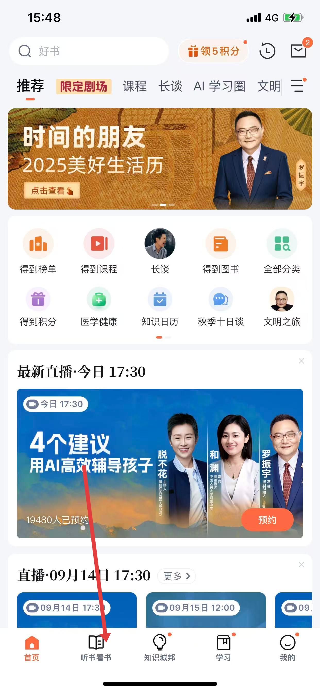 1、打開得到App,點擊底部導航欄中的聽書看書選項。
