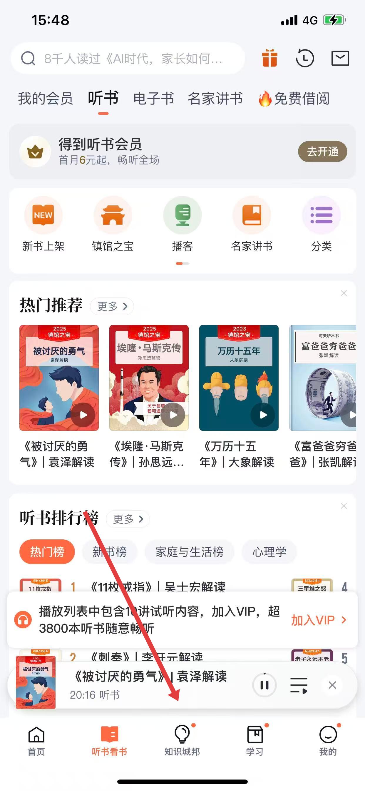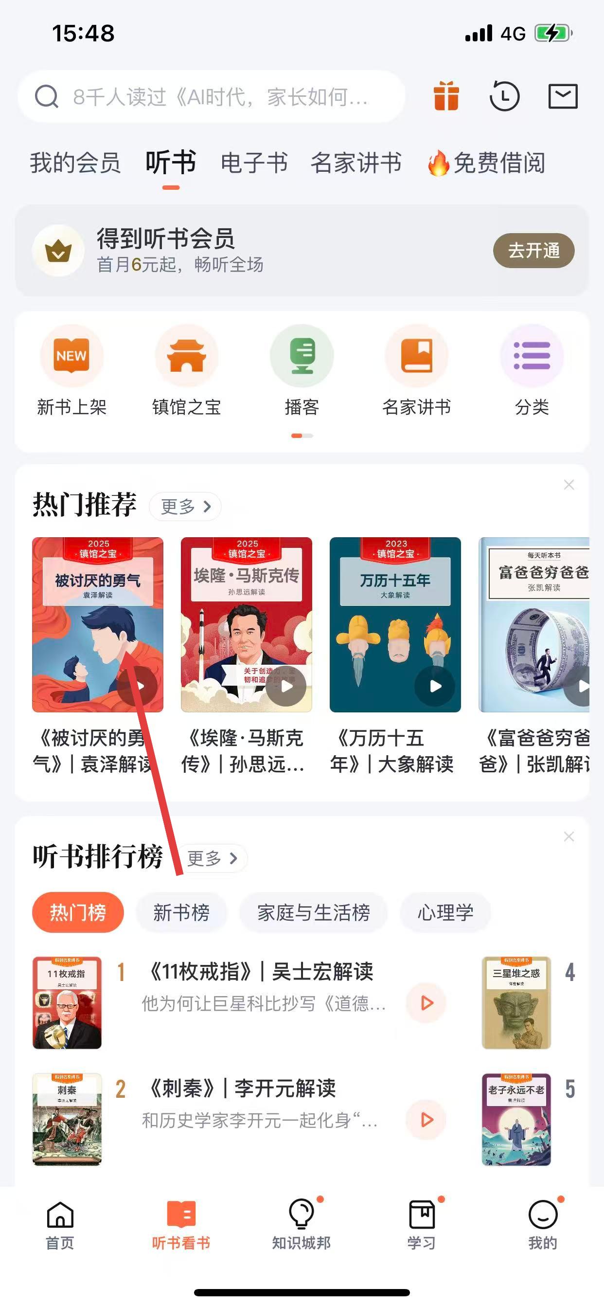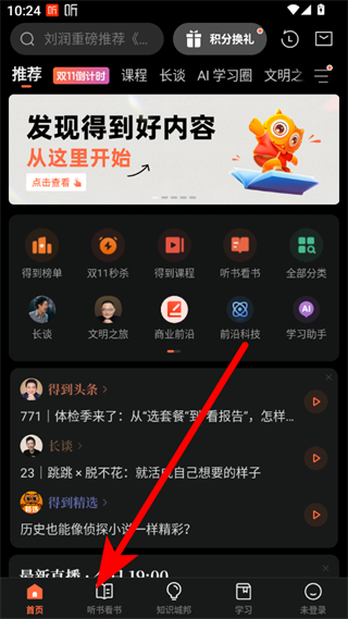 1、在得到首頁,點擊底部聽書看書選項,進入聽書頁面。