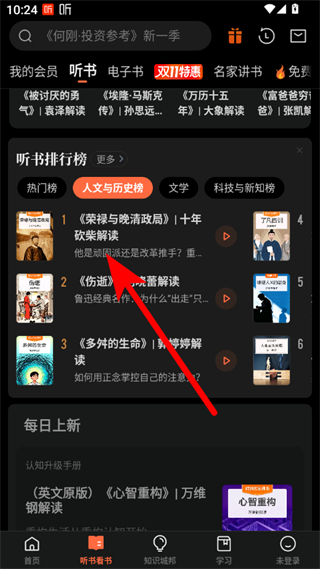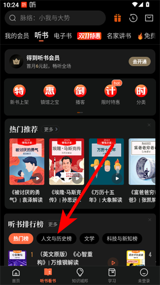 2、在聽書頁面,選擇聽書排行榜中的榜單,如人文與歷史榜,進入榜單頁面。