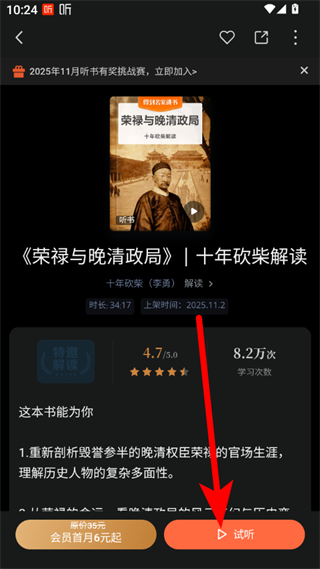4、在書籍詳情界面,點擊試聽按鈕,即可開始聽書。