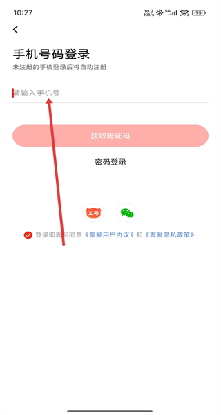 3、在進(jìn)入到手機(jī)號(hào)碼登錄頁(yè)面,在輸入框填寫(xiě)手機(jī)號(hào)后,點(diǎn)擊獲取驗(yàn)證碼進(jìn)行登錄。