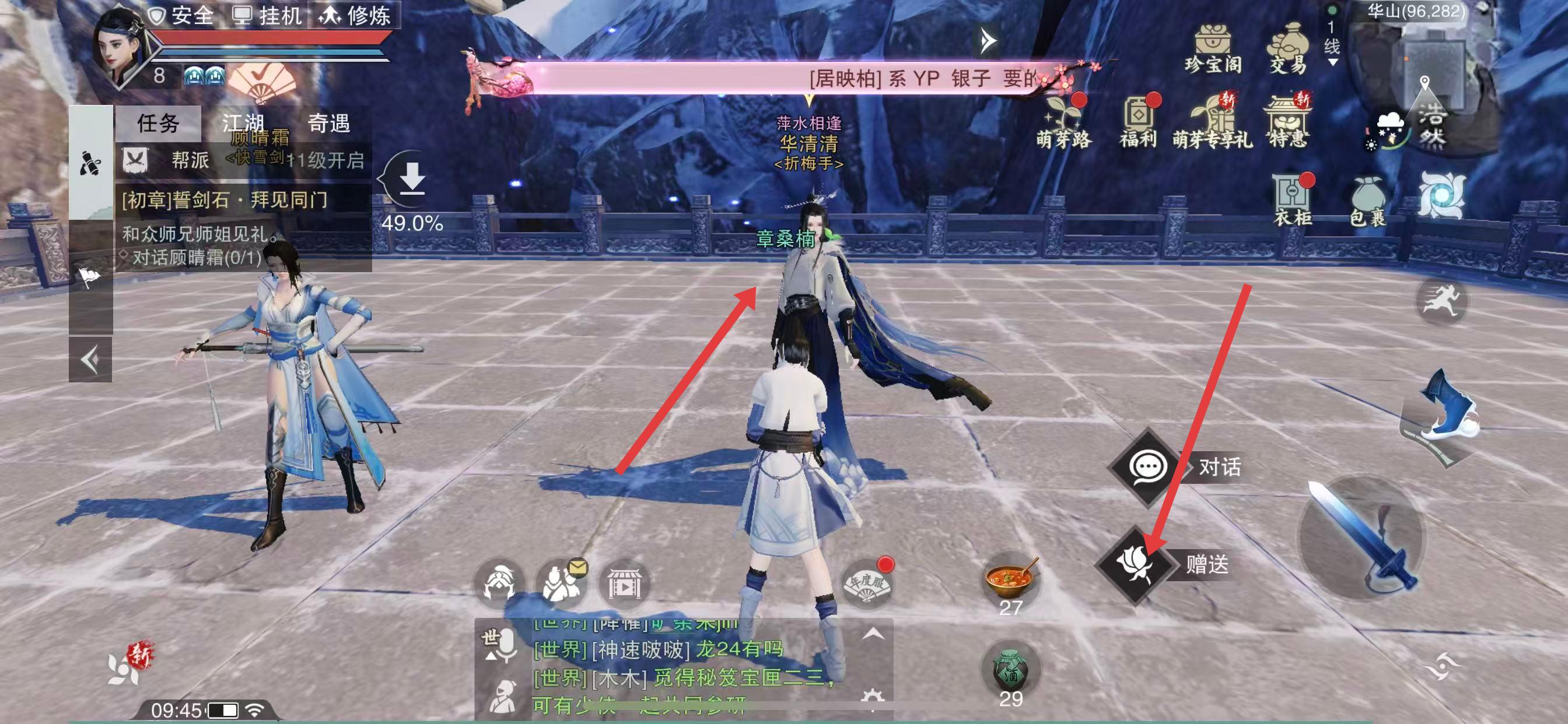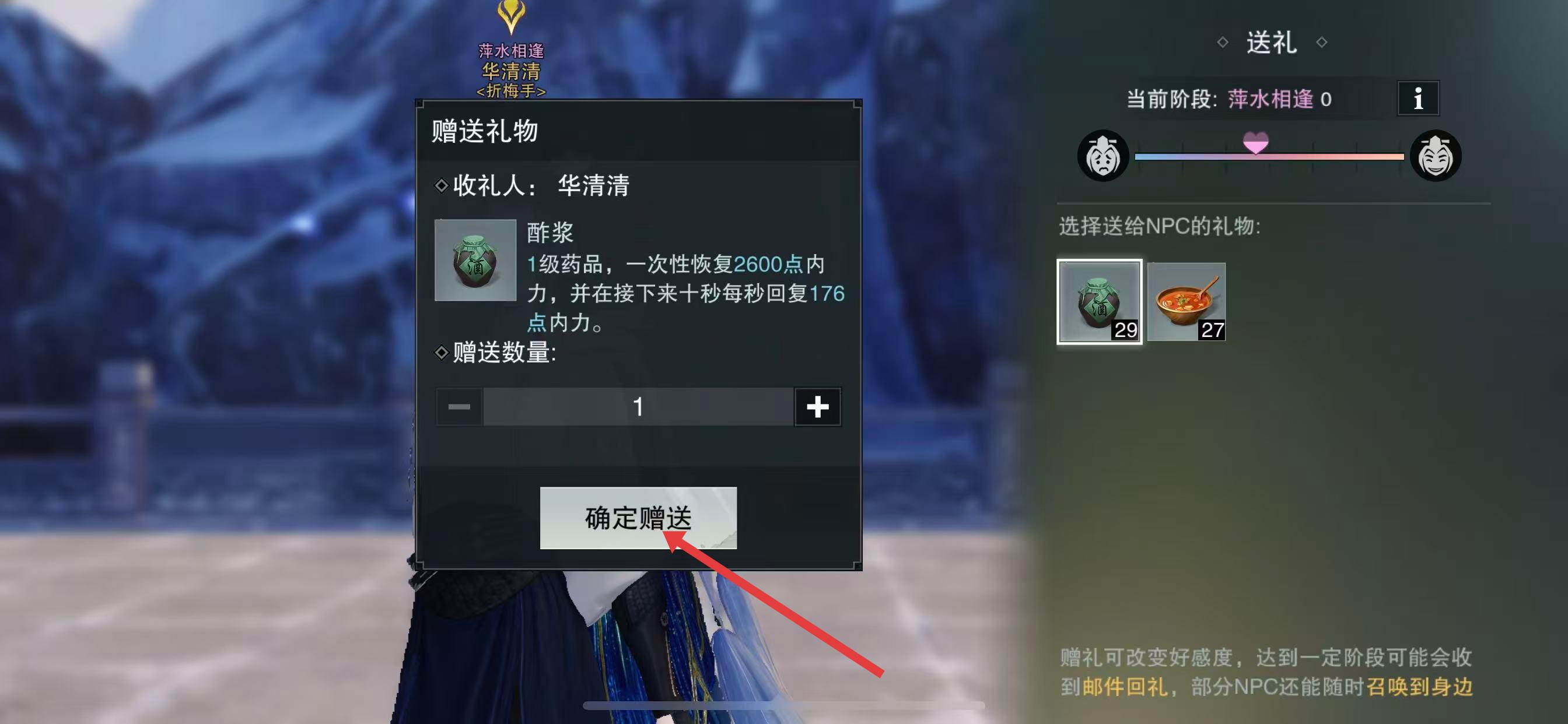 1、在游戲主界面找到想要贈(zèng)送禮物的NPC,靠近后點(diǎn)擊NPC,點(diǎn)擊贈(zèng)送按鈕。