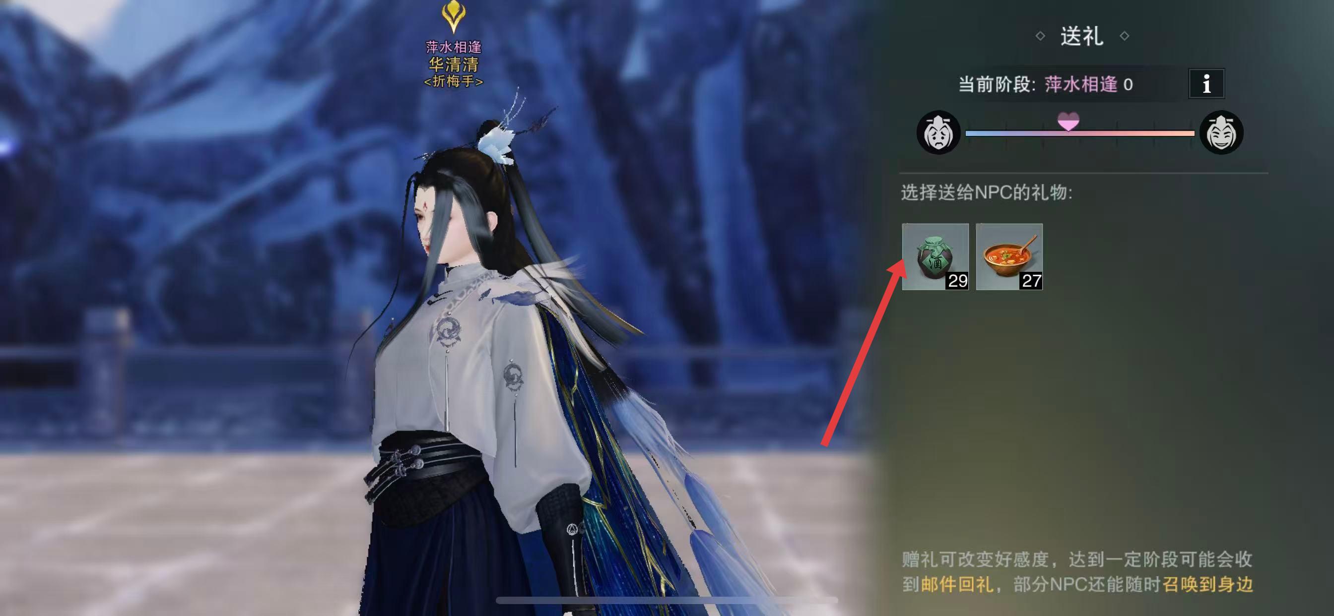 2、進(jìn)入送禮界面,界面右側(cè)顯示出可送給該NPC的禮物列表。