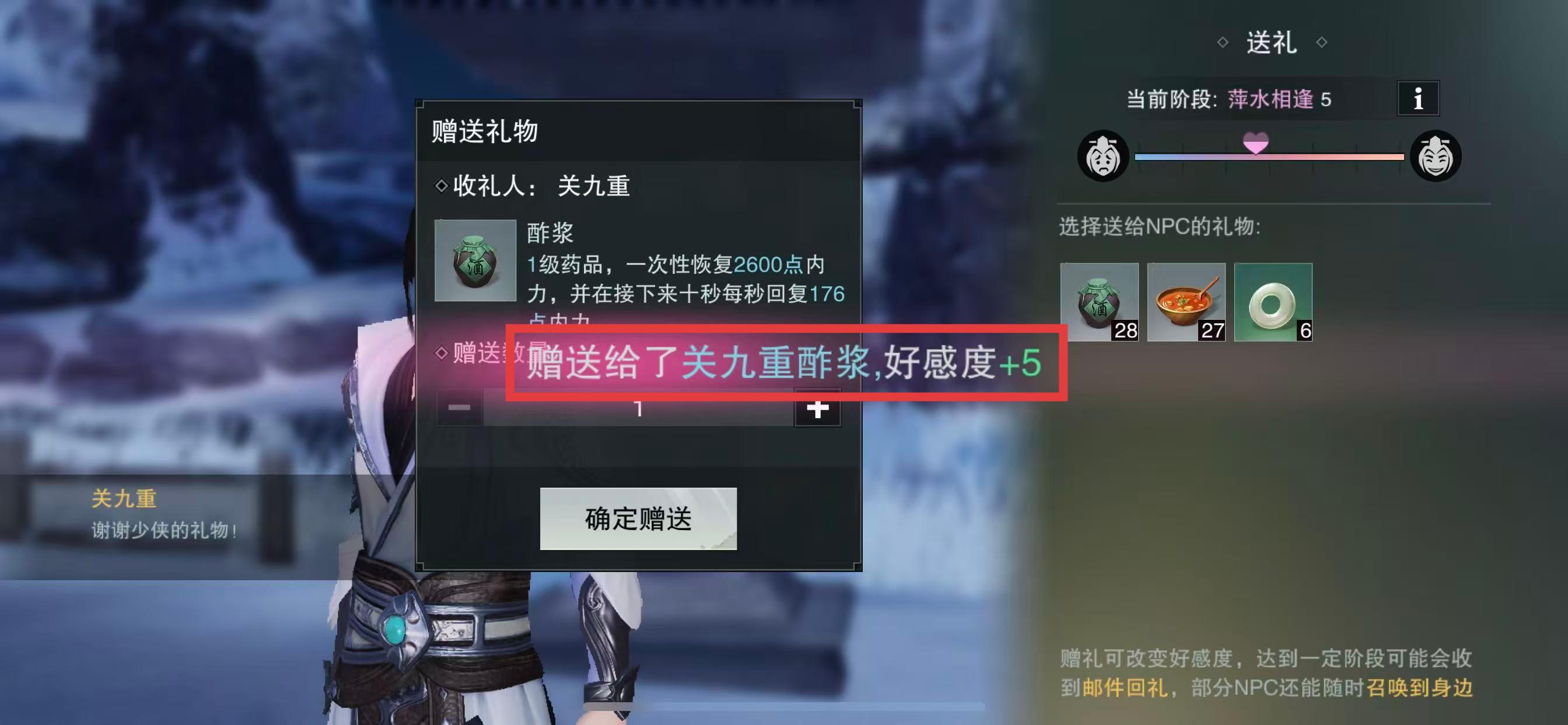 4、贈(zèng)送成功后,會(huì)有提示信息顯示增加的好感度 。