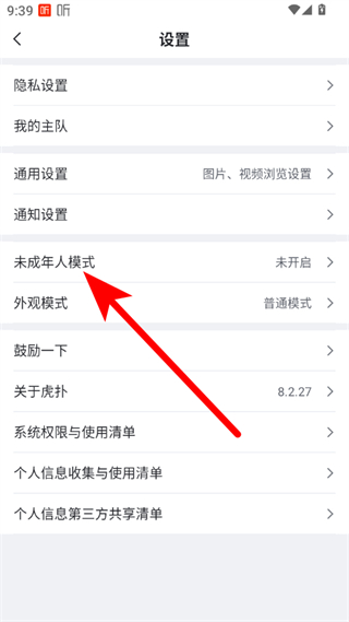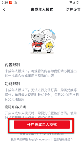 4、在未成年人模式界面,點(diǎn)擊開(kāi)啟未成年人模式按鈕,即可開(kāi)啟虎撲未成年模式。