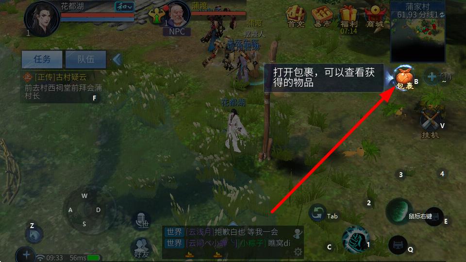1、進(jìn)入游戲場(chǎng)景點(diǎn)擊屏幕右側(cè)包裹按鈕,查看獲得的物品,開啟裝備操作流程。