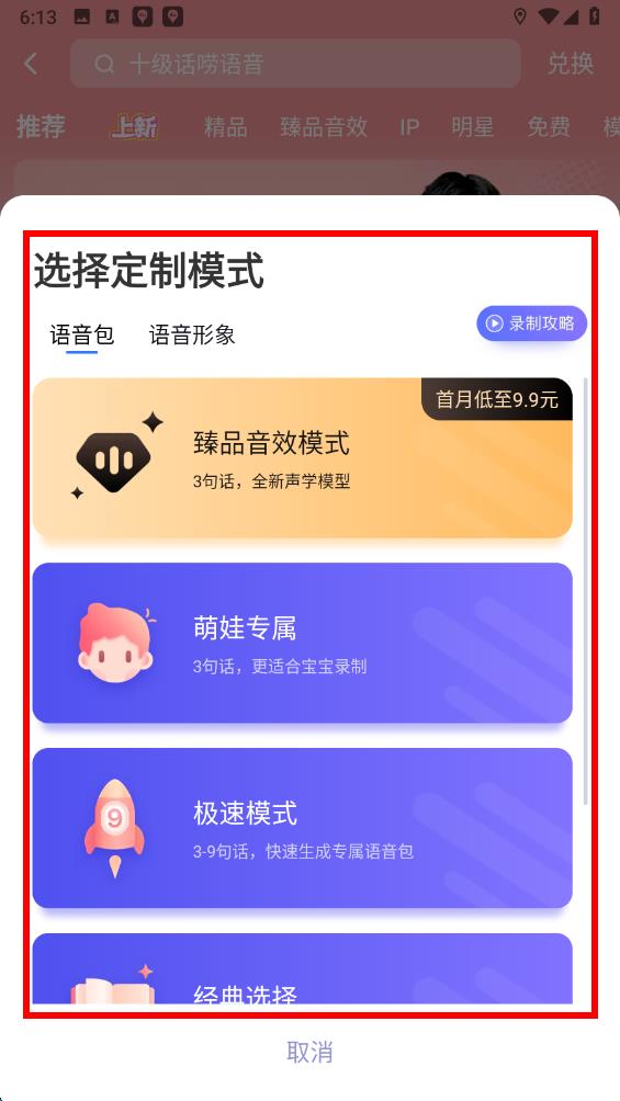 4、點擊錄制后,在彈出的選擇定制模式窗口中,根據(jù)自身需求選擇如合適的錄制模式,然后按提示完成語音錄制即可。