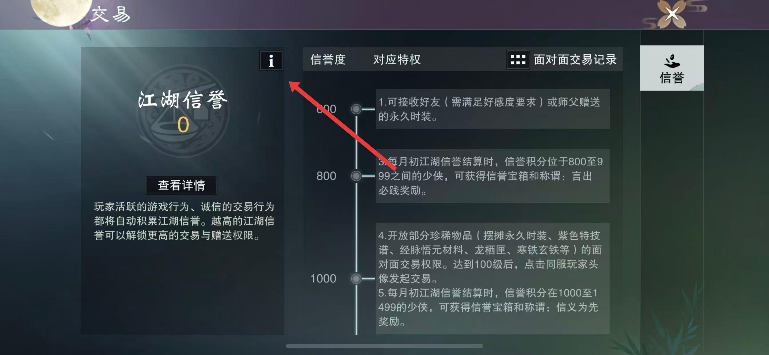2、進(jìn)入江湖信譽(yù)界面后,在左側(cè)就能看到當(dāng)前的江湖信譽(yù)值。