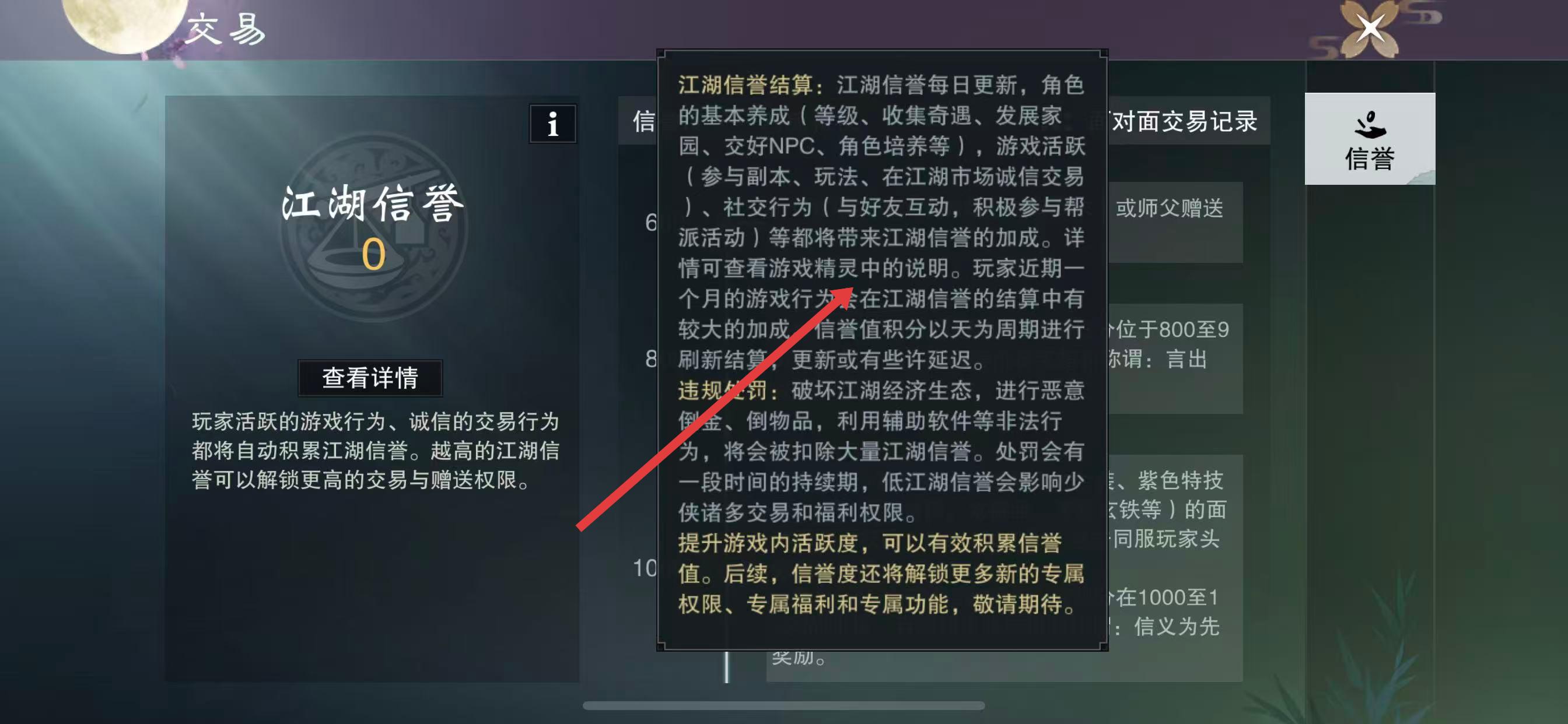 3、點(diǎn)擊信譽(yù)值旁邊的i圖標(biāo),還能查看江湖信譽(yù)的結(jié)算規(guī)則、違規(guī)處罰說(shuō)明,以及提升信譽(yù)值的相關(guān)信息。
