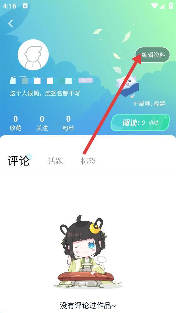 2、在個(gè)人主頁(yè)界面,點(diǎn)擊編輯資料,進(jìn)入個(gè)人資料頁(yè)面。