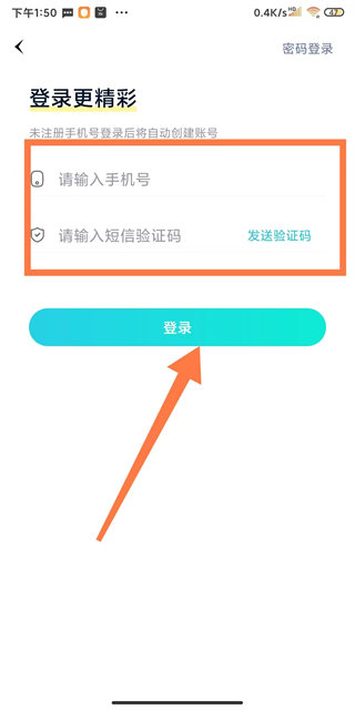 4、在手機(jī)號(hào)登錄信息填寫界面,輸入手機(jī)號(hào)和驗(yàn)證碼,點(diǎn)擊登錄按鈕,即可完成手機(jī)號(hào)登錄操作。