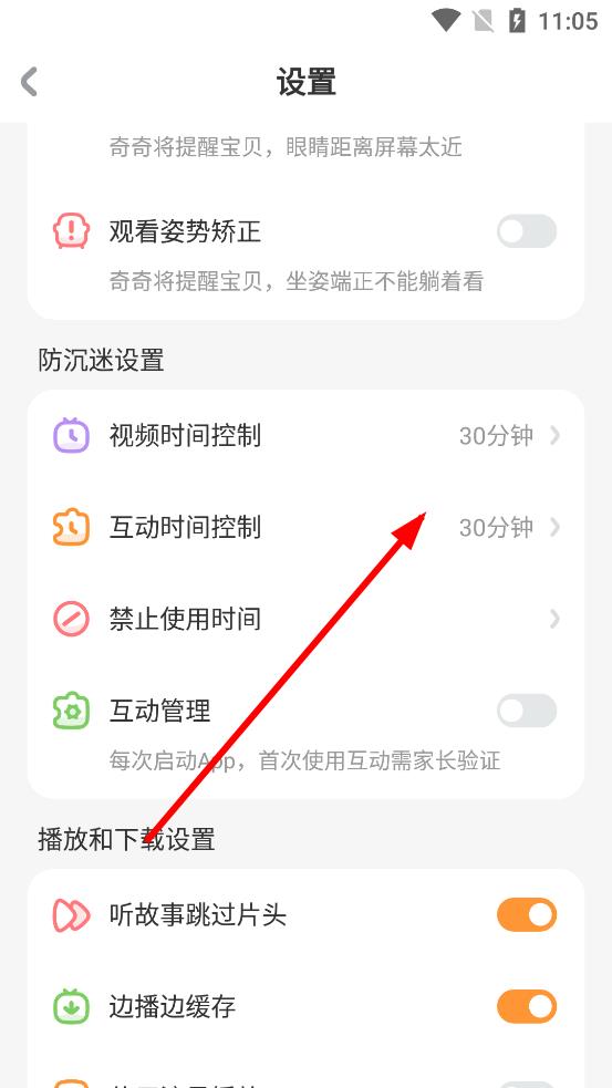 3、在設(shè)置頁面的防沉迷設(shè)置板塊,點(diǎn)擊視頻時(shí)間控制或互動(dòng)時(shí)間控制選項(xiàng),選擇或自定義想要設(shè)置的時(shí)間限制即可。