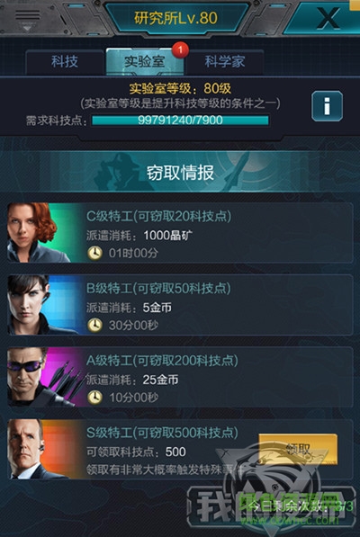 想獲取更高等級科技,必須先提升實驗室等級,那么,這時候,就需要科技點數(shù)的累積了!不過,科技點數(shù)可不是類似資源那樣自動生產(chǎn)就有的,想獲取科技點數(shù),還得靠每天的派遣不同等級特工去“竊取情報”!作為獎賞,竊取情報還將有幾率觸發(fā)一系列神秘特殊事件,為玩家提供額外的強力道具喔!