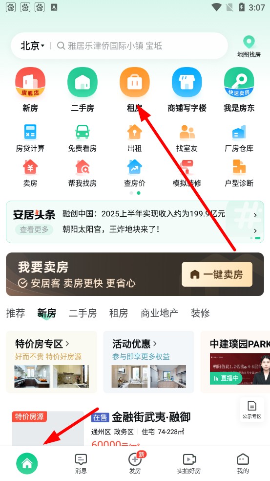 1、打開安居客APP,在首頁點擊租房圖標,進入租房業(yè)務板塊。