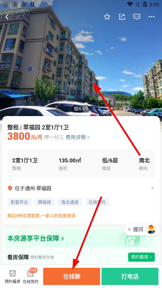 3、進入房源詳情頁,可查看房屋外觀、戶型等信息,若想進一步溝通,點擊在線聊按鈕聯(lián)系房東。