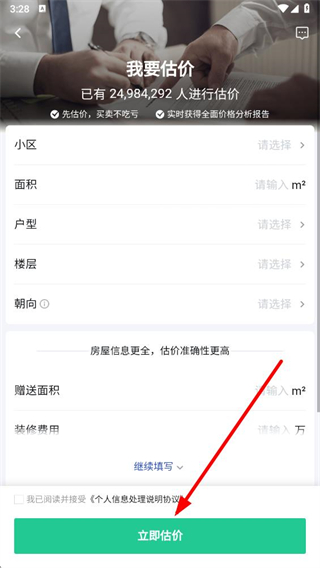 3、在頁面填寫房源信息,若有贈送面積和裝修費用也可填寫,點擊立即估價。