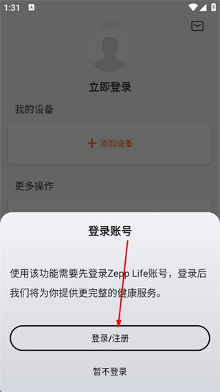 2、在登錄賬號(hào)提示框中,點(diǎn)擊登錄/注冊。