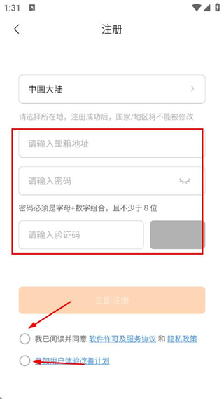 4、輸入郵箱地址、設(shè)置密碼,輸入驗(yàn)證碼,勾選協(xié)議,點(diǎn)擊立即注冊。