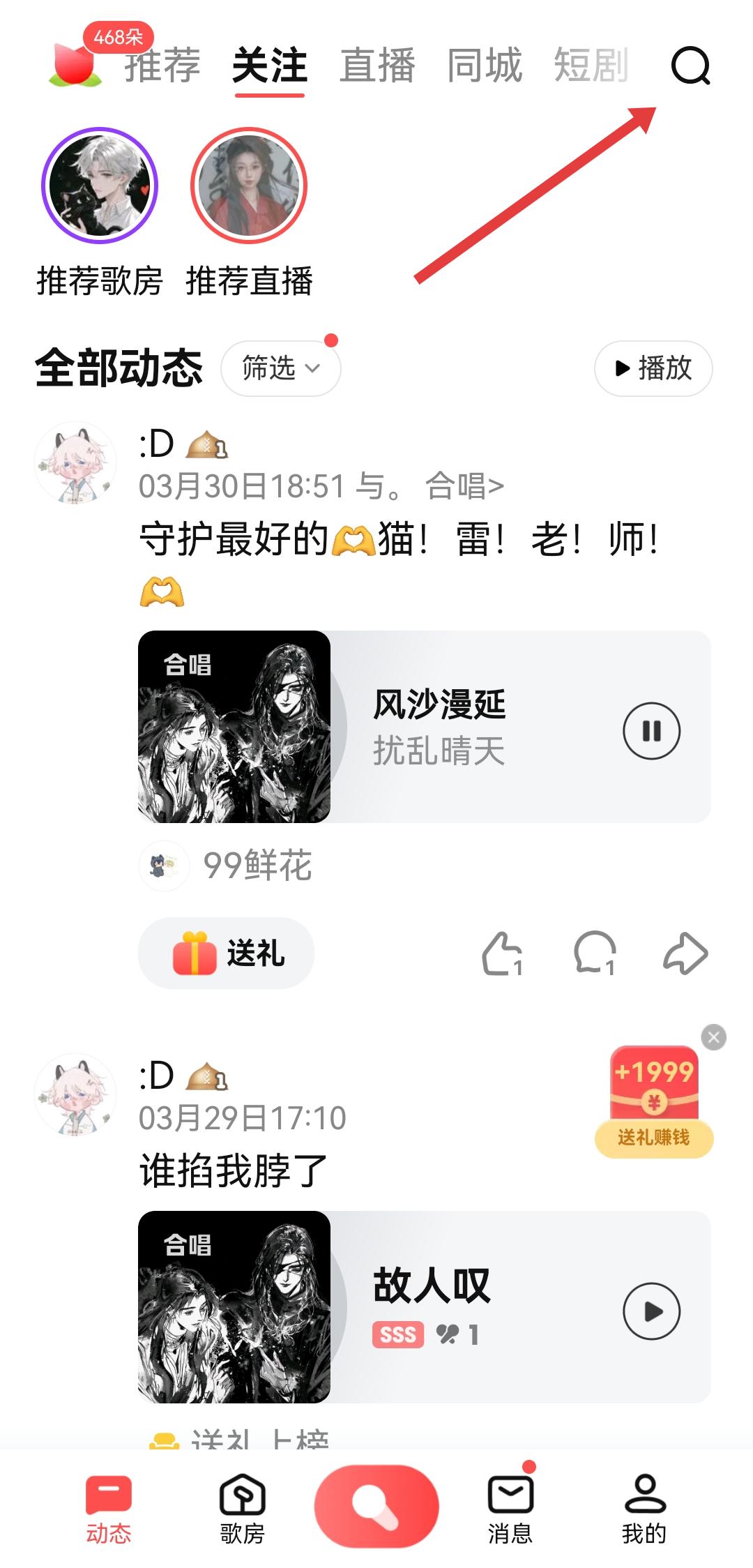 1、進入全民K歌動態(tài)的頁面,需要點擊右上角的搜索圖標,進入搜索的界面。