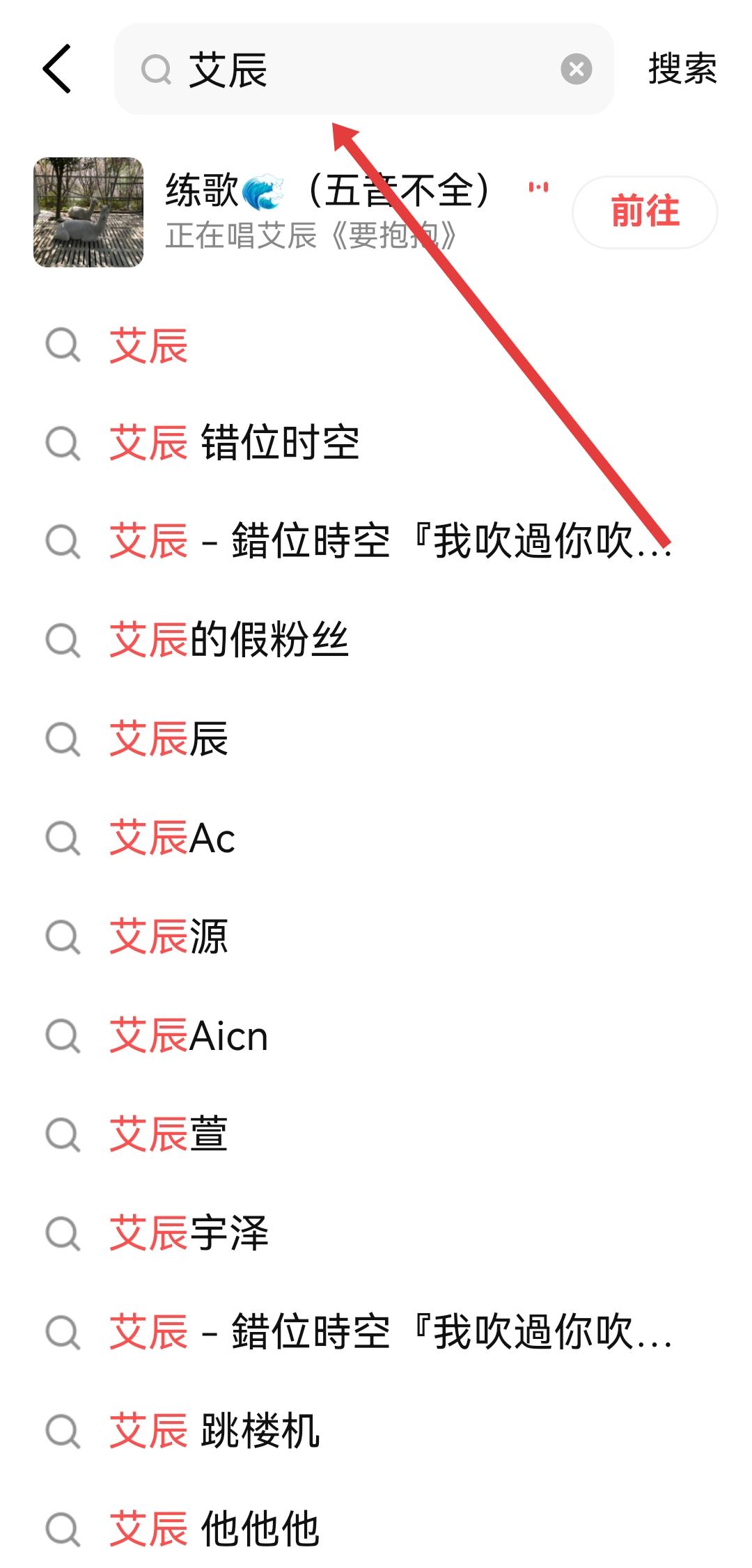 2、在k歌的搜索欄中輸入自己需要關注的K歌號名稱如艾辰,查看搜索的結果。