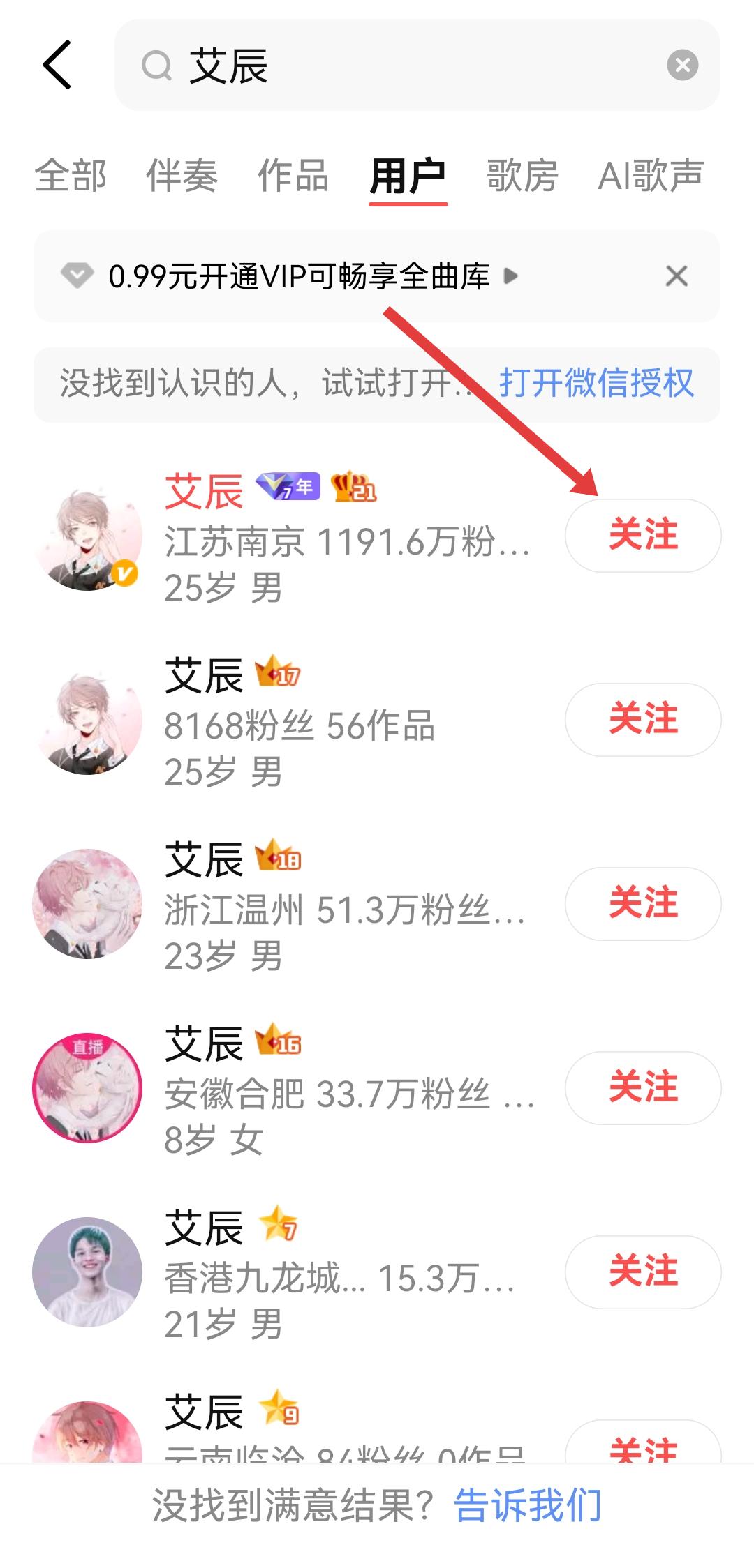 3、在搜索結果的用戶列表中,找到目標K歌號,點擊其右側(cè)的關注按鈕,即可關注該K歌號。