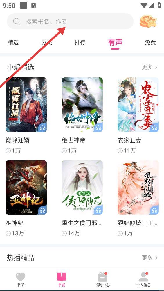 2、點(diǎn)擊搜索框,輸入想要聽的書名,點(diǎn)擊搜索。