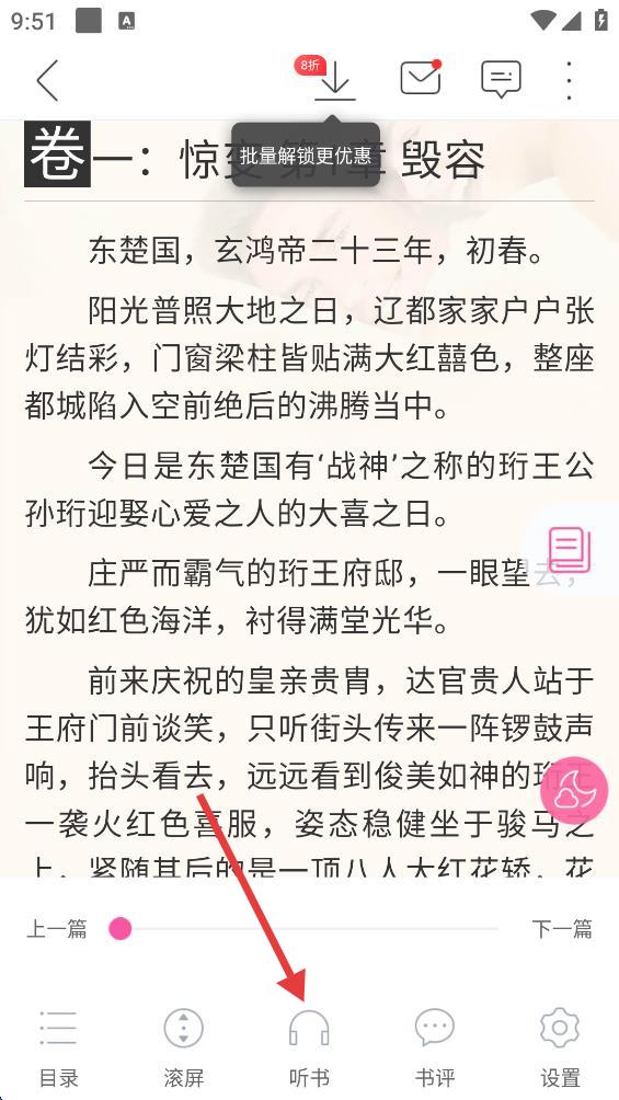 3、進(jìn)入小說(shuō)頁(yè)面,點(diǎn)擊下方的聽書圖標(biāo),即可開始聽書。